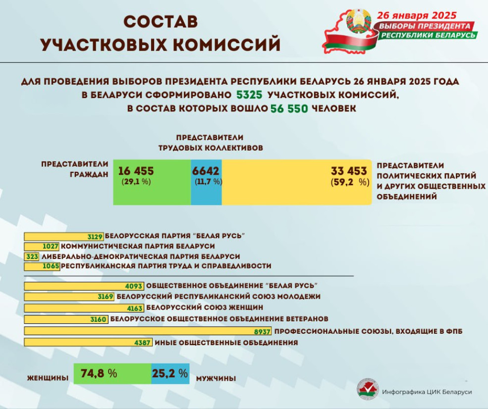 В состав 5325 участковых комиссий вошло 56550 человек. Большинство из них (59,2 %) – представители политических партий и других общественных объединений.